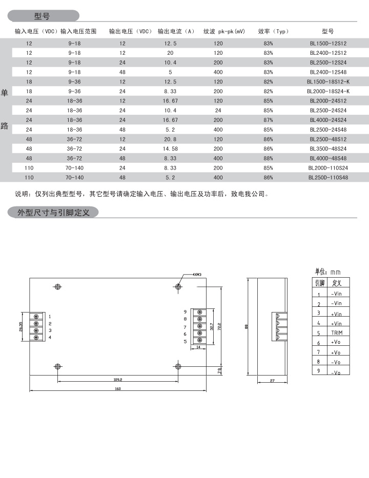 功率:150-500W 輸入電壓:9-18VDC 18-36VDC 36-72VDC 9-36VDC 70-140VDC 輸出路數(shù):?jiǎn)温?br /> 外形尺寸:160*88*27mm 安裝方式:端子式